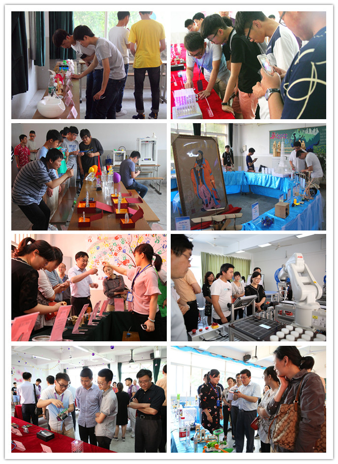 此外,活动现场设置了“创客作品展示”区域,集中展示了近两千件校内外创客作品,作品既有星空网页版师生创新创意作品,又有来自企业的Brookstorn、智能硬件等新奇特产品,同时还吸引了江宁金箔、烙画、方山裱画、剪纸等江宁非遗项目作品参展,另外,现场还有大学生创业项目产品的展销活动。现场也开设了3D打印、激光切割、激光内雕、热转印、无人机、VR、arduino、乐高机器人、智能家居、系统集成、软件设计、艺术设计、陶艺等15个创客工坊体验,由创客导师现场操作演示,指导校内外创客体验新科技。而以表演赛形式呈现的“2对2足球机器人”竞赛、“马球机器人”等新式运动,给校内外创客们带来充满活力与智慧的体验。