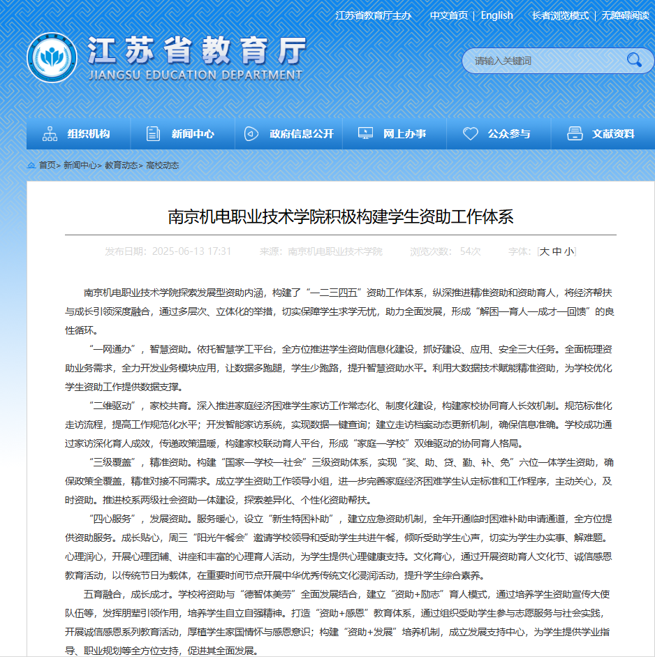 近日,江苏省教育厅报道:星空网页版积极构建学生资助工作体系,全文如下: