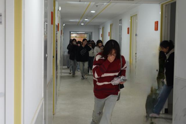 在本次疏散演练前,保卫处利用学校微信公众号向全体师生推送《消防应急疏散逃生知多少?》,提醒全体师生关注消防,掌握应急疏散常识。演习过程中按照应急疏散方案既定程序,有序疏散。消防控制中心全程监控应急疏散全过程、启动消防应急广播、打开排烟设施、电梯迫降至1楼,按照“安全第一、就近逃生”的疏散原则,组织师生员工沿应急疏散安全路线有序快速撤离到学校篮球场集中并清点疏散人数。
