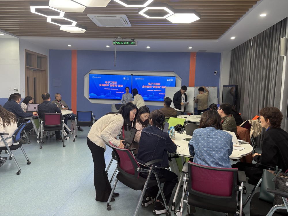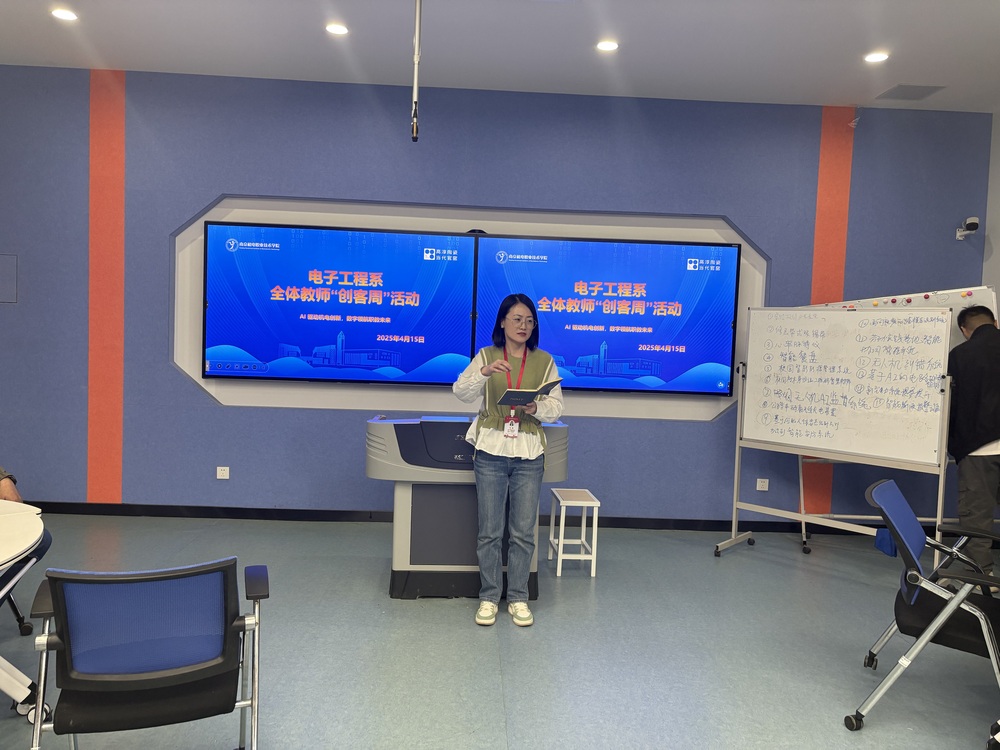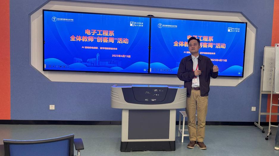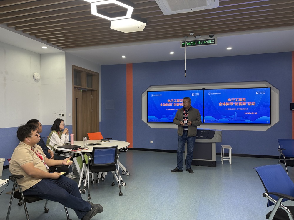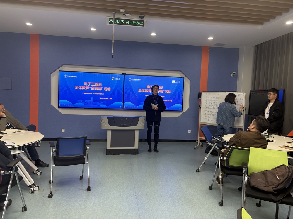 2025415日,电子工程系全体教职工在思学楼409智慧教室开展了以“AI驱动机电创新,数字领航职教未来为主题的2025年电子工程系教师创客周活动。党委委员、副校长刁爱军作为党支部驻点领导亲临现场指导,本次活动由系主任姚小冬携全体教职工积极参与,共同见证了这场创新思维与实践碰撞的盛会。青年教师章闯主持本次活动