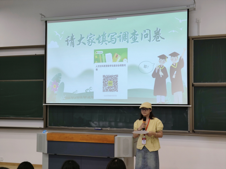 在互动交流环节,受助学生代表们敞开心扉,畅谈受助后的学习生活变化与未来规划。有同学坦言,助学金的支持让自己告别了为温饱奔波的焦虑,得以全身心投入学习中,在专业竞赛中斩获佳绩;也有学生通过勤工俭学岗位,不仅收获了经济支持,更积累了实践经验,明确了职业发展方向。为精准锚定受助学生的成长需求,座谈会现场特别设置了“即时调研” 环节。人文社科系关工委提前精心编制涵盖资助政策认知、学习与成长情况、职业规划与发展三大维度的调查问卷,通过“现场填写 + 即时回收”的方式,构建起“数据收集 — 问题梳理 — 当场研讨”的闭环机制。这份凝聚着教育智慧的问卷,不仅成为师生深度对话的 “桥梁”,更以详实的数据支撑为后续资助政策优化提供了科学依据,切实将“以生为本” 的理念贯穿于育人实践全过程。
