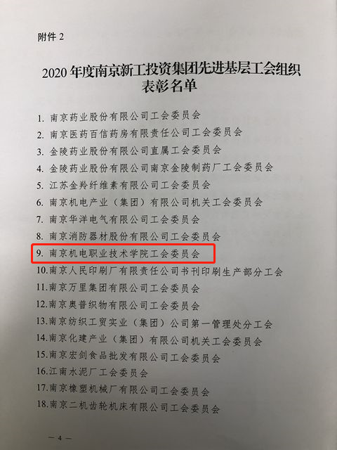 4月28日下午,南京新工投资集团工会组织开展庆“五一”先进表彰活动。学校工会荣获2020年度新工集团工会“先进基层工会组织”荣誉称号、培训处毛奇处长被授予2020年度新工集团“优秀工会积极分子”荣誉称号。