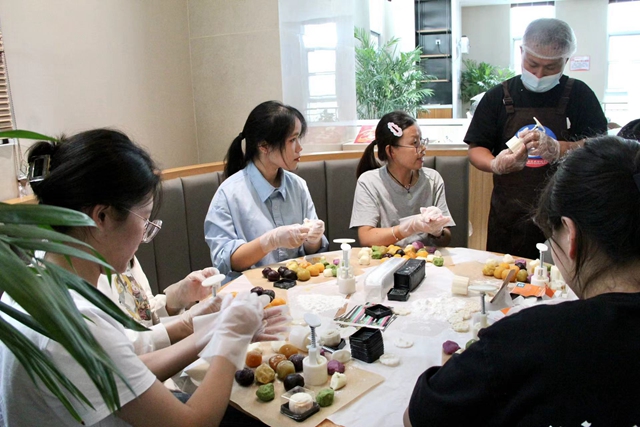 本次活动共分两个环节,即月饼制作环节和花灯制作环节。月饼制作环节由专业的糕点师傅进行现场指导教学,参加活动的学生跟着糕点师傅认真揉搓馅料、擀起面皮,用模具压刻成一个个精美的月饼。在花灯制作环节,参加活动的教职工们跟着指导老师从固定流苏入手,通过做篓框、装灯、穿珠子、绑杆子等一系列步骤后,精美的花灯就完成了。