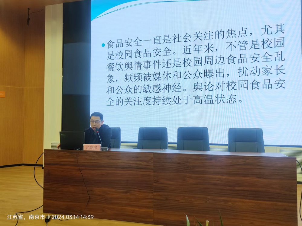 南京市市场监督局食品处沈晓阳副处长,对参会人员开展了学校食堂食品安全培训。沈晓阳处长通过江西“鼠头鸭脖”事件,以及组织管理、场所布局、设施设备、过程管控、应急处置、档案资料管理、食品按自查与风险隐患排查等方面对食品安全规范、流程进行了详细解读。