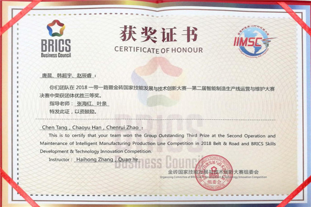 “2018‘一带一路’暨金砖国家技能发展与技术创新大赛 第二届3D打印与智能制造技能大赛国内总决赛”,于2018年7月5日至7月8日期间在内蒙古赤峰市举行,机械工程系和自动化工程系联合组队参加了此次比赛,荣获智能制造中国赛区总决赛优胜三等奖,总决赛评分排名第12名的好成绩。