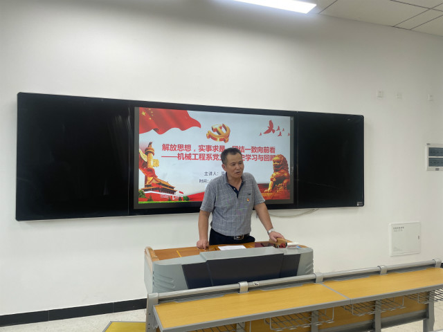 为响应学院学党史、悟思想、办实事、开新局的政治号召,机械工程系党支部于2021年6月17日下午三点,在博学楼301开展了本学期党史学习的第三课,对之前的党史学习进行了回顾和总结,并重点学习了改革开放前后的中共党史和发展历程。本次党史学习教育,系部李杰书记作为主持人,特别邀请了我系深谙党史研究的吴自明老师作为主讲人,全系教职工参加了此次学习活动。