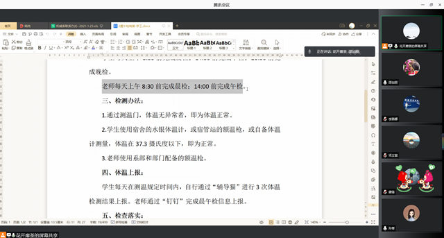 为有效防控新型冠状病毒感染肺炎疫情,将危害降低到最低程度,切实保障学院师生的健康与生命安全,根据省、市教育、防疫部门相关文件精神,学院制定了星空网页版防控新冠肺炎疫情工作方案、星空网页版突发公共卫生事件应急预案以及相关制度。为了将文件精神贯彻到底,2021年9月14日下午,机械设计与制造教研室全体教师在腾讯会议平台,对学院制定的方案与制度文件进行了学习。