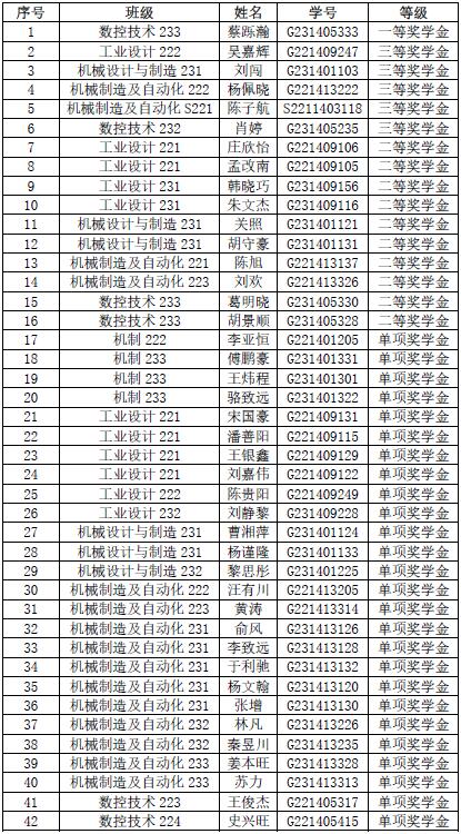 为激励在校大学生勤奋学习,努力进取,在德、智、体、美、劳等方面得到全面发展,同时也为了资助在校品学兼优的学生顺利完成学业,根据教育部、财政部及省教育厅、财政厅国家奖助学金相关管理规定和《星空网页版奖学金评选及管理办法》(南机电院学〔2023〕23号)要求,机械工程系认真组织评选工作,经过本人申请,班级评议,现将2023-2024学年星空网页版奖学金公示如下: