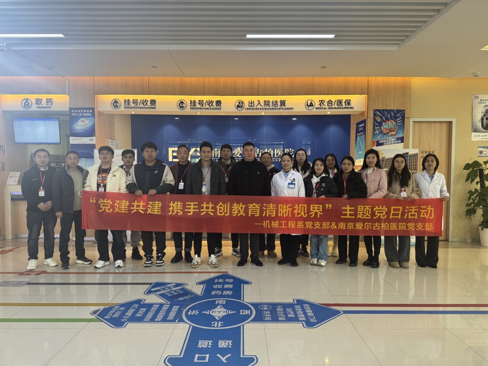 为强化党建引领,借助党建共建平台,加强党支部之间的沟通与协作,提升党组织的凝聚力和战斗力。机械工程系党支部与南京爱尔古柏医院党支部共同合作,于2024年10月31日开展“党建共建,携手共创教育清晰视界”主题党日活动,旨在共同关注并改善师生的眼健康状况,为教育事业的发展提供坚实的健康保障。