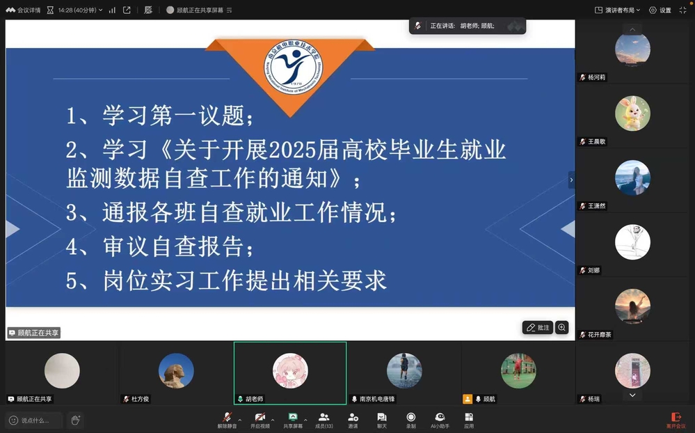 在就业工作部署环节,胡枫通报了2025届各班当前就业进度数据,针对不同班级的差异化情况制定了分级推进策略。她强调,就业数据的及时更新是精准开展就业服务的前提,要求辅导员严格落实协议转合同线上上传规范,确保就业信息链条完整可追溯。同时,她明确提出阶段性目标:本月底前需实现85%的就业率,鼓励辅导员团队紧盯未就业学生群体,通过“一对一”帮扶、企业岗位精准推送等举措,全力推动就业工作提速增效。