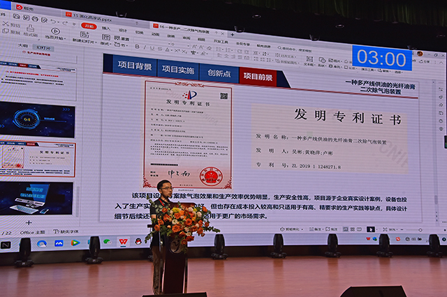 在创意设计组,人文社科系学生周慧颖的《敦煌博物馆IP形象及文创设计》对著名壁画—九色鹿形象进行了卡通化改造,设计出一系列充满童趣的文创产品,大幅度提升博物馆辨识度,进一步宣传了中国传统文化;机械工程系吴彬老师的《一种多产线供油的光纤油膏二次除气泡装置》提供了一种高效安全的去除光纤油膏气泡的解决方案,采用二次分级除气泡的方法,使除气泡率达到90%左右,增加输出油膏油泵数量,有效提高光纤涂覆生产率。