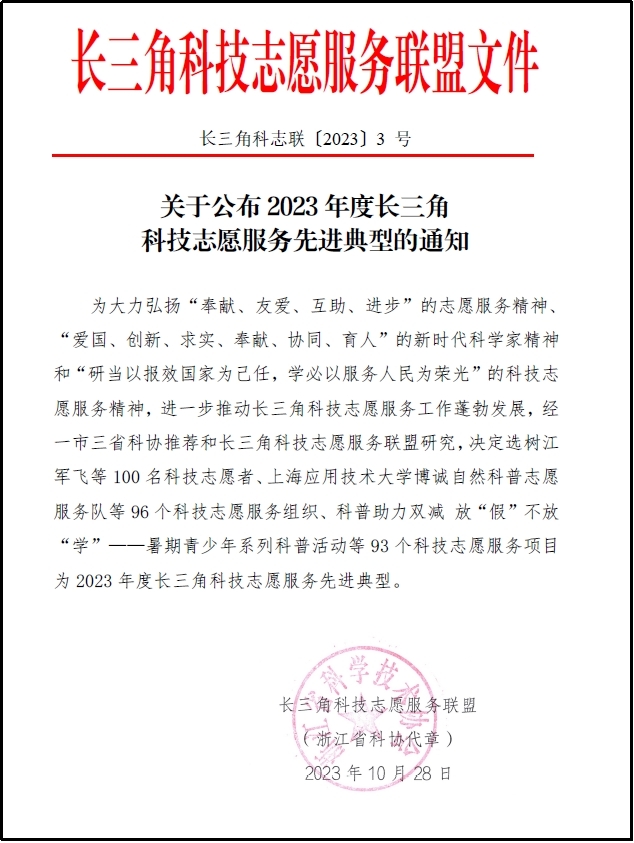 近日,我校科技志愿支队在2023年度长三角科技志愿服务先进典型评选活动中被授予“2023年度长三角优秀科技志愿服务组织”称号。