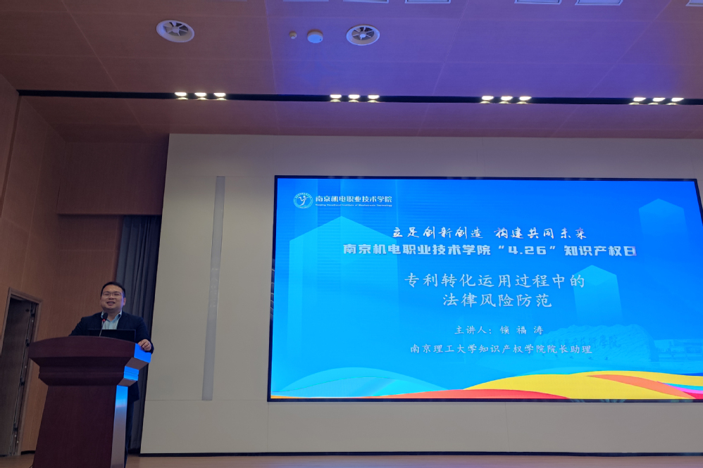 主题报告分享环节,由南京理工大学知识产权学院锁福涛院长做了主题为《专利转化运用过程中的法律风险防范》的演讲。锁福涛院长详细介绍了专利转化运用概述、专利权属风险与防范、合同约定风险与防范三部分内容,结合案例对当前专利转化运用过程中面临的法律风险进行了深入剖析,并提出了切实可行的防范措施,为我校师生提供了宝贵的指导和建议。