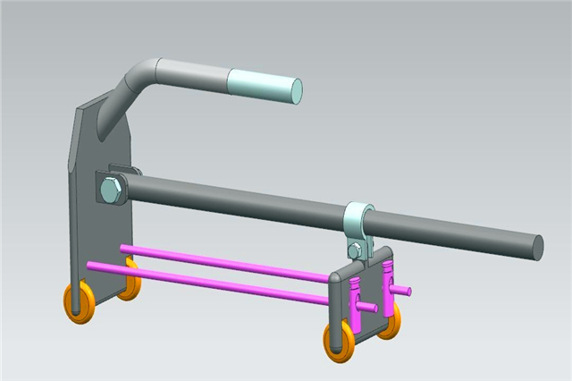 该搬运设备整体结构精巧,使用过程中将本设备套在块状物件上通过后夹板将块状物件夹住,再通过松紧带进行固定,最后手握把手即可在平面推送搬运,遇到需要抬起的地方,将把手朝上即可将物件抬起,操作极为方便,便捷。