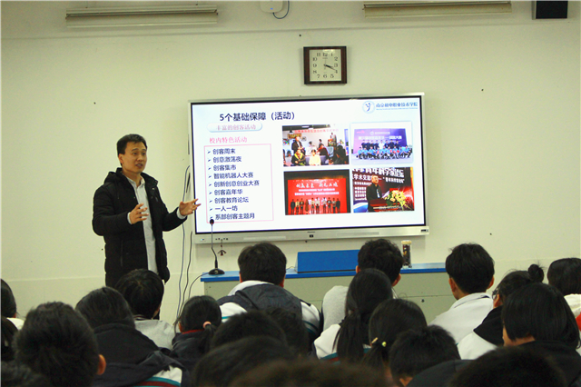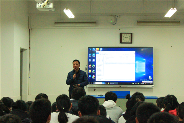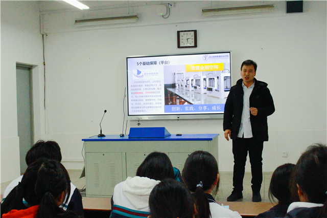 江苏省高淳中等专业学校副校长钱自豪对王主任的到来表示热烈欢迎。随后,王国珍主任结合自己的创新经历向在座师生介绍了我校倾力打造的创客校园文化。王主任说,星空网页版于2015年建设国内首家创客校园,倾力打造集创意、设计、制造于一体的蓝岛创客空间,系统设计了“54333”创客教育体系。在学校的积极引导和政策鼓励下,全院师生的创新能力显著提高,专利申请和授权数量不断增加,学校逐渐形成了“人人皆能创新,人人皆可创新”的创客校园环境。王主任勉励在座学生:创新需要积累,用手机上的备忘录把每一个生活中不经意的想法记录下来,不断挖掘生活中的痛点,思考并不断优化解决方案,在日积月累之中,创意也许就会出现在眼前。现场师生报以热烈的鼓掌。
