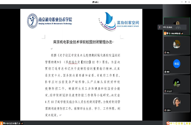 会上,王国珍主任解读了《星空网页版校园封闭管理办法20220409》,强调教研室教师经学院疫情防控领导小组审核批准返校后,需签署健康承诺书,提供连续三天核酸检测阴性证明、健康码和行程码,并测量体温,符合条件方可进校;在校的教师需配合每日一检制度。因疫情影响,参加比赛的双创班学生材料购买等也需严格遵守学院管理办法。黄克瑶老师提出要双创班导师通过视频会议对双创班学生进行赛前辅导和防疫要求说明。