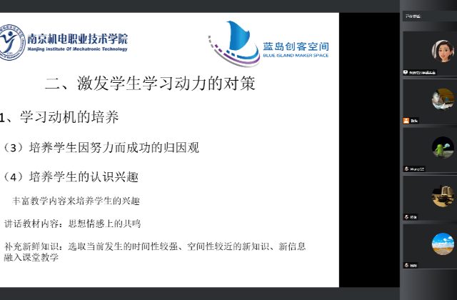 学生的学习动力取决于兴趣,兴趣又往往来源于教师的讲授和有目的培养。9月27日,蓝岛创客空间创新教研室以“如何激发学生的学习动力”为主题开展了线上教研活动。本次教研活动由蓝岛创客空间朱妍焘老师主持,蓝岛创客空间王国珍主任及教研室全体老师参加了本次教研活动。