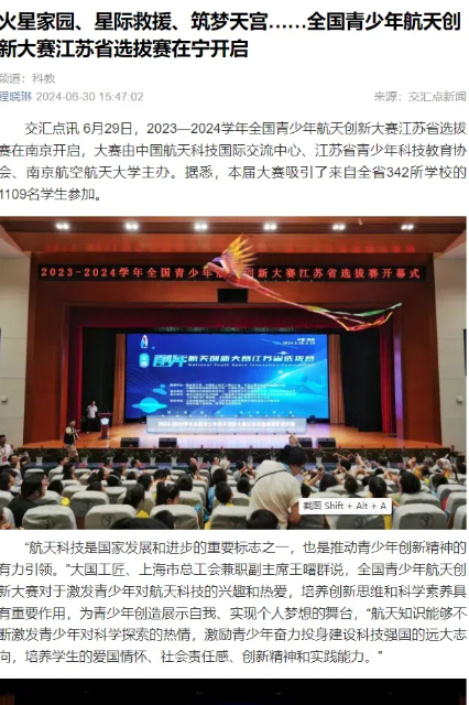 2023-2024学年全国青少年航天创新大赛江苏省选拔赛在我校的成功举办,标志着我校在青少年科技人才培养与科普教育领域的又一重要突破,更是我校教育历程中一个闪耀的里程碑。时代洪流滚滚向前,科技之树常青,创新与技术创造的浪潮正以前所未有的势头席卷而来,其中,航空航天科技的日新月异尤为瞩目,它如同璀璨的星辰,引领着人类社会向未知的宇宙深处勇敢探索。本次大赛的举办激发了无数青少年的航天梦想与创新激情,鼓励他们以无畏的勇气、饱满的热情,在航天科技的浩瀚星海中扬帆起航,不懈追求。青少年,作为国家的明日栋梁与希望之光,承载着推动社会进步与科技创新的历史使命。少年者,人生希望,人生之春,广大青年应当勇于探索,勇于创新,为国家的繁荣富强贡献自己的力量。随着2024年6月29日大赛的成功举办,其影响力迅速跨越校园界限,成为社会各界尤其是主流媒体争相报道的热点。从多维度、广视角出发的深入报道,不仅全面展现了赛事的精彩瞬间与青少年的卓越风采,更在全社会范围内再次点燃了人们对航天科技及宇宙奥秘的浓厚兴趣与无限遐想。