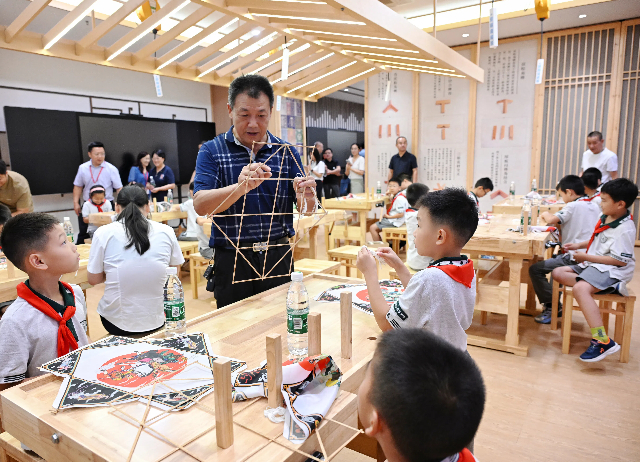 接着,与会者前往弘德楼二楼参观非遗工坊。精美的秦淮花灯、精致的榫卯结构制品、精巧的板鹞风筝让参与者们沉浸在非遗项目的独特魅力中。南师附中的学生们更是亲身体验了风筝的制作,感受着古老文化的传承与创新,对传统文化有了更深刻的认识和感悟。