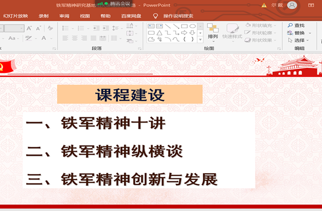 最后,思政中心许青娟等7位老师分别向大家进行了课程汇报。党委工作部周启国主任、张玥副主任分别进行了点评,并提出了修改意见。一、PPT里多充实一些生动的图片;二、注意目录的凝练表达;三、课程研究资料的共建共享非常重要;四、进一步弘扬铁军精神,推进相关课程建设。