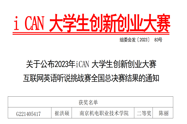 2023年11月19日,由高等学校外语教学研究会与中国信息协会教育分会合作举办的2023年iCAN大学生创新创业大赛互联网英语听说挑战赛在东南大学圆满落幕。我校人文社科系英语教研室陈丽老师指导的机械工程系数控技术224班崔洪硕同学荣获国赛二等奖,全国排名第九。