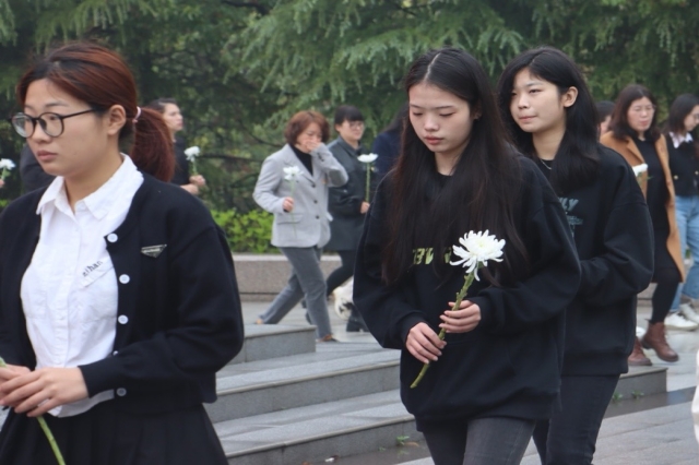 仪式伊始,两位党员代表缓缓走上前,将盛满鲜花的花篮敬献在烈士纪念碑前,学校党委委员、纪委书记姜振宇上前整理挽联。随后,在肃静的氛围中,全体人员向烈士默哀,表达对先烈的深切哀思和崇高敬意。默哀过后,重温入党和入团誓词,铿锵有力的誓言在陵园上空回荡。