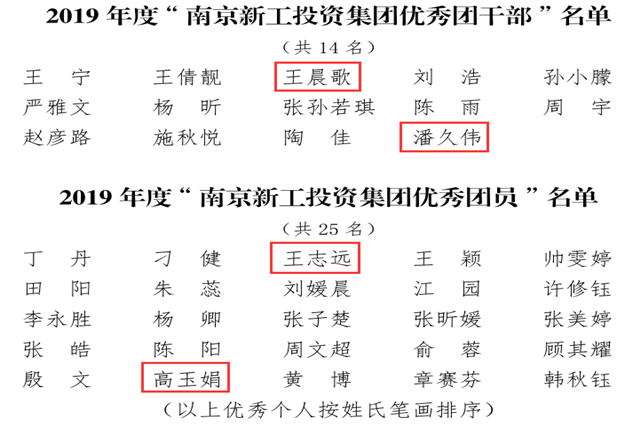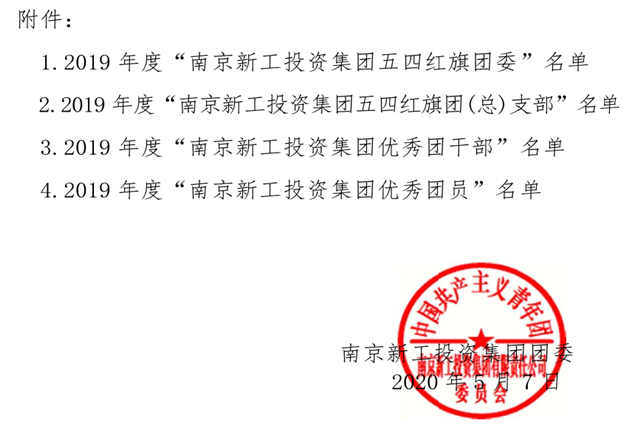 2019年以来,各级团组织、团干部和广大团员青年深入学习贯彻习近平新时代中国特色社会主义思想和党的十九大精神,树牢“四个意识”、坚定“四个自信”、坚决做到“两个维护”,奋发有为、真抓实干,推动共青团工作取得了新的成绩,涌现出一批先进集体和先进个人。为表彰先进,树立典型,引导和激励广大团员、团干部和各级团组织不断进取,再创佳绩,新工投资集团团委决定,授予星空网页版团委“2019年度南京新工投资集团五四红旗团委”称号;星空网页版机械工程系团总支“2019年度南京新工投资集团五四红旗团(总)支部”称号;授予潘久伟同志、王晨歌同志“2019年度南京新工投资集团优秀团干部”称号;授予信息工程系学生高玉娟、电子工程系学生王志远“2019年度南京新工投资集团优秀团员”称号。