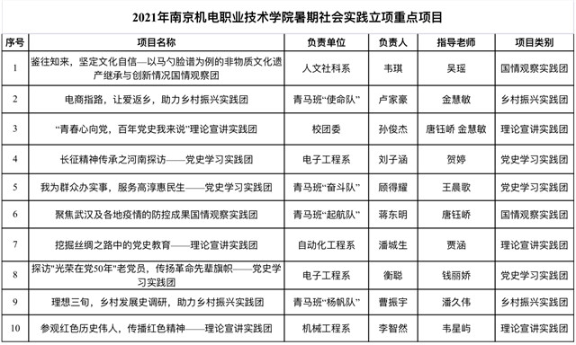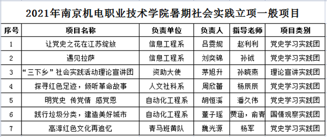为深入学习宣传贯彻习近平新时代中国特色社会主义思想,贯彻落实习近平总书记关于青年工作的重要思想,引导和帮助广大青年学生上好与现实相结合的“大思政课”,在社会课堂中受教育、长才干、作贡献,在观察实践中学党史、强信念、跟党走,努力成为担当民族复兴大任的时代新人,以实际行动庆祝中国共产党成立100周年,按照团省委《关于开展2021年全省大中专学生志愿者暑期文化科技卫生“三下乡”社会实践活动的通知》相关要求,经自主申报,各团总支、青马班审核推荐,校级专家评审,确定以下10个项目为2021年星空网页版暑期社会实践重点立项项目,7个项目为2021年星空网页版暑期社会实践立项一般项目,并对立项的校级重点项目和一般项目进行经费支持,现公示如下: