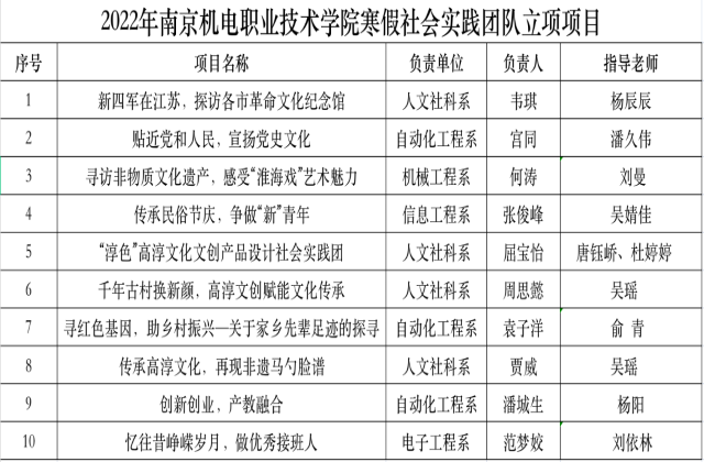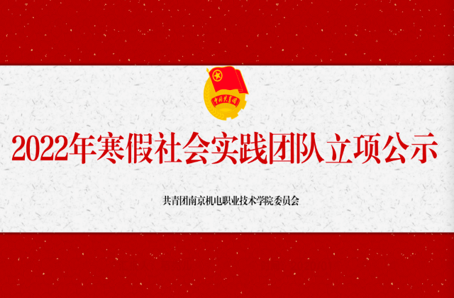 为深入学习贯彻习近平总书记在庆祝中国共产党成立100周年大会的重要讲话精神,进一步推动爱国主义教育与实践育人工作深度融合,引导机电学子以强国一代新青年的良好精神面貌迎接党的二十大胜利召开,庆祝中国共产主义青年团成立100周年。团委决定开展“小我融入大我,青春献给祖国”2022年星空网页版大学生寒假社会实践活动。经自主申报,各团总支、青马班审核推荐,校级专家评审,确定以下10个项目为2022年星空网页版寒假社会实践团队立项项目,并对立项的项目给予经费支持,现公示如下: