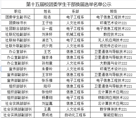 以上名单为2023年6月第十五届校团委学生干部换届选举名单,特此公示。