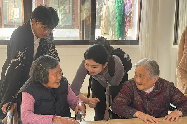 10月24日下午一点整,由槿漫轩花社、云裳汉服社,DIY创意社、生活部的部分代表同学从星空网页版出发前往高淳高堂老街颐养中心看望爷爷奶奶。在护理姐姐的主持下,同学们与爷爷奶奶一起玩起数字游戏,一下就拉近了彼此的距离。