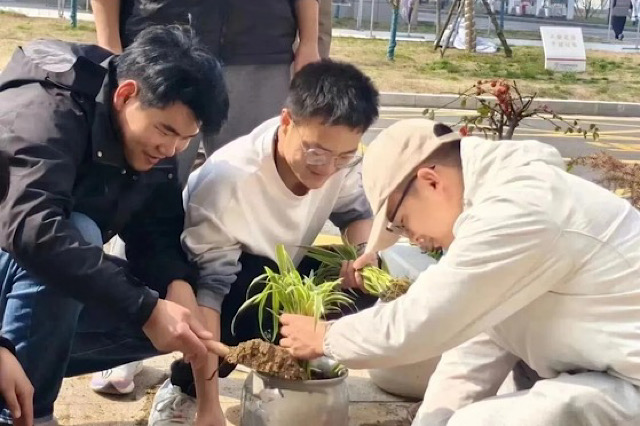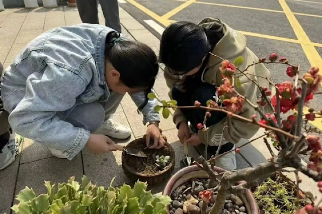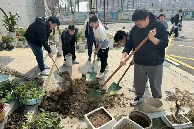 袅袅春风三月天,移花种树恰当前。同学们分工合作,从挥锹铲土,到选取花盆、放苗回填、浇水灌溉等,每一个环节都一丝不苟,活动现场到处是同学们热火朝天的忙碌身影和体验劳动的欢声笑语。经过同学们的共同努力,一棵棵月季苗、玫瑰苗,芍药、玉树、紫荆花、茉莉花都在花盆里安了家,迎风而立在校园中,错落有致、萌发出盎然生机。