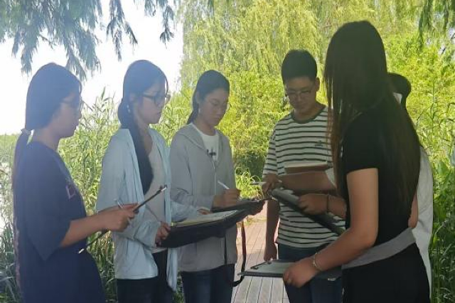 第一天,他们将目光聚焦在荷花池上,用素描的方式捕捉荷叶的脉络和光影的流转,将大自然的美丽定格在画纸上。第二天,他们漫步在古建筑群中,细致地描绘飞檐斗拱的细节,同时思考荷花与建筑之间的艺术融合,探索更多的创作灵感。到了第三天,作品点评会和文化资料的收集活动,使得同学们的创作灵感更加丰富,具有了深厚的文化底蕴。
