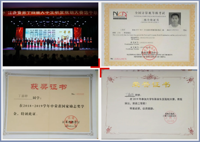 入学以来获得江苏省第十四届职业规划大赛一等奖,江苏省第十一届蓝桥杯软件设计大赛二等奖,外观设计专利证书1项,软件著作权3项,并积极参加公益活动,成为江苏省儿基会99公益日活动志愿者。