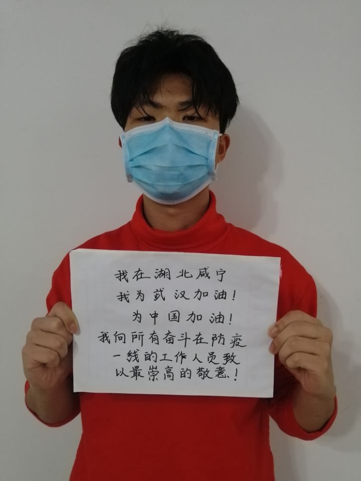 软件技术193班黄康政同学:我在湖北咸宁,我为武汉加油!为中国加油!我向所有奋斗在防疫一线的工作人员致以最崇高的敬意!