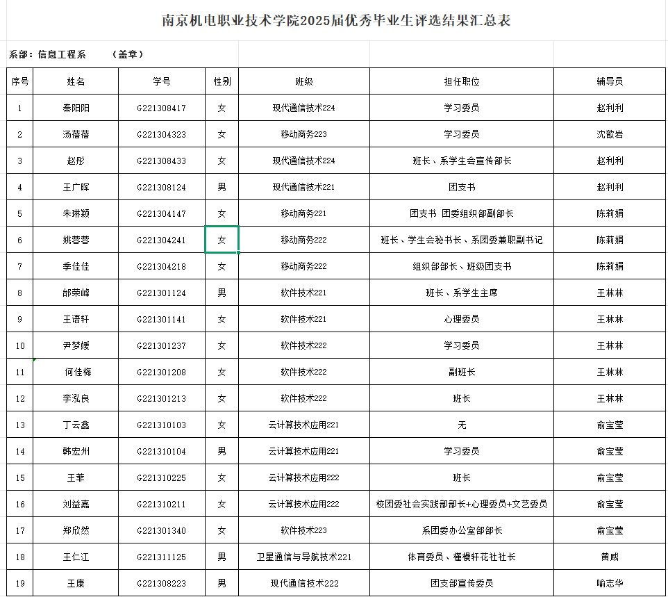 根据《关于评选2025届优秀毕业生的通知》(南机电院学﹝2025﹞4号)文件精神,经班级评选,系部审核,决定拟推荐以下17名同学为2025届星空网页版优秀毕业生。现予以公示,公示时间:2025年4月24日——2025年4月26日。联系人:郝麒,电话:18061237654。