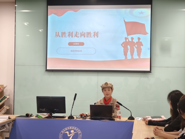 活动开场,臧琼介绍左星桥的成长历程。作为该系软件技术专业毕业生,左星桥在校时深耕专业知识,积极投身校园志愿服务与学生工作,用行动诠释“责任”;2025年年初,她主动报名参与 2025 年九三阅兵民兵方队选拔,经数月高强度训练,凭坚韧意志与过硬素质完成阅兵任务,成为方队中亮眼的青春风景。