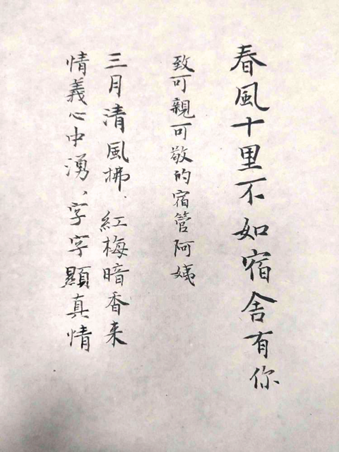 三月清风拂,红梅暗香来。情义心头涌,字字显真情。三月的鲜花,带着我们的牵挂与祝福盛开。今天是“三八”妇女节,祝南京机电所有的女神们节日快乐!在这个特殊的节日里,学生宿舍管理委员会携宿舍区全体学生向宿管阿姨表白:因为有你,温暖如家!