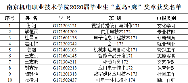 根据《星空网页版关于开展2020届毕业生“蓝岛•鹰”奖章评选推荐工作的通知》,经系部评审小组初步审核,学工处复核,专家评审组评审,决定拟推荐以下10名同学为2020届毕业生“蓝岛•鹰”奖章获得者。现予以公示,公示时间:2020年7月2日—2020年7月6日。联系人:宁燕,电话:025-84190262。