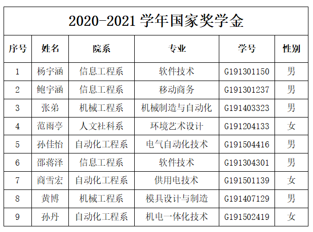 根据《教育部财政部关于印发<本专科生国家奖学金评审办法>的通知》(教财函〔2019〕105号)以及《江苏省学生资助资金管理办法》《江苏省学生资助管理实施细则》《省教育厅关于做好2021年普通高校国家奖学金有关工作的通知》苏教助函〔2021〕12号文的相关精神。我院认真落实国家奖学金评审相关细则,各系部通过召开系部国家奖学金评审小组会议,认真贯彻落实国家奖学金评定要求,本着公开、公正、公平的原则,经学生个人申报,班级评议通过,上报系部评议小组,经系部评议审核通过,公示完毕。正式上报学院大学生资助管理中心,经学院大学生资助管理中心复审,召开学院2020-2021学年国家奖学金评审会,拟确定9位同学为星空网页版2020-2021学年国家奖学金获得者。