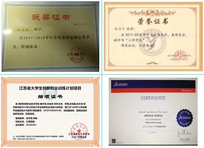 大学期间,专业成绩排名系部第二名,综合素质测评排名第一。在班级担任班长、院资助宣传大使,曾任星空网页版单片机社团社长、蓝岛创客工坊学生负责人等。曾获得国家奖学金、国家励志奖学金、全国大学生挑战杯江苏赛区三等奖、中英STEAM江苏赛区最佳编程奖、江苏省大学生创新创业训练计划结项证书、学院奖学金、学院三好学生、学院优秀学生干部、学院优秀共青团员、社团之星、“一二九大合唱”二等奖、优秀标兵等荣誉称号。同时本人获得院优秀社会实践团队、优秀社会实践个人的荣誉称号、“欧帝杯”三创大赛优秀奖等。我所在班级在2018-2019学年被评为“江苏省省级优秀班集体”,“南京市五四红旗团支部”。