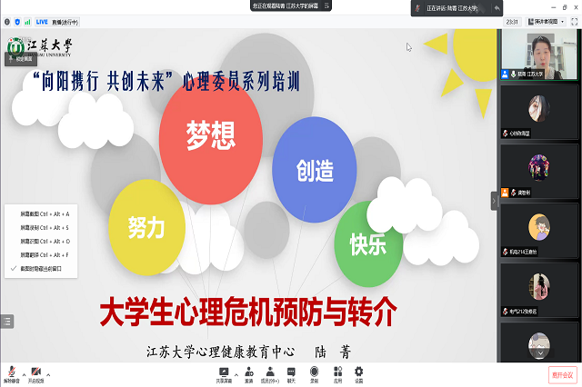 江苏大学陆菁老师将心理学的专业知识与大学生现实生活相结合,用通俗易懂的语言向心理委员们解释什么是心理危机,其特征是什么;讲解如何从人群中筛选出重点关注对象;以及一些重点关注对象心理问题程度初判别的方法。陆老师用情景问答的形式解答了心委们工作中的常见困惑。