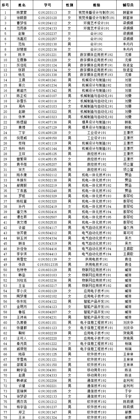 根据《关于评选2022届优秀毕业生的通知》(南机电院学﹝2022﹞7号)精神,经班级评选,系部审核,学工处复核,决定拟推荐以下 78名同学为2022届星空网页版优秀毕业生。现予以公示,公示时间:2022年6月6日—2022年6月10日。联系人:钱老师,电话:025-86676234。