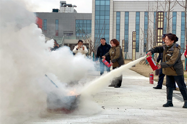 演练过程中,保卫处胡章龙老师详细地讲解了灭火器的种类及其规范和使用方法,以及在发生火灾事故后的基本扑救方法。胡老师强调:灭火前需正确选择合适的灭火器,灭火时迅速提起灭火器,拔掉保险销,站在上风方向,用力按压灭火器压把,对火焰的根部左右扫射,直至火焰被干粉完全覆盖熄灭。按照胡老师教授的方法,现场人员进行了实地灭火演练,面对熊熊燃烧的火焰,现场人员丝毫不畏惧,沉着冷静地对准火焰根部左右扫射,直至火焰被干粉完全覆盖熄灭。