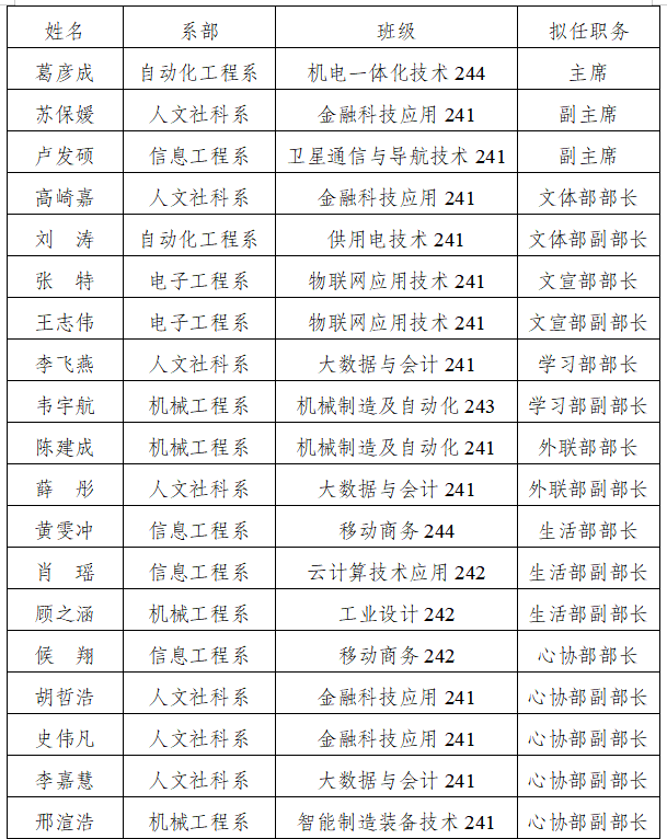 根据《星空网页版学生会章程》相关规定,为切实加强学生干部队伍建设,校学生会于2025年6月开展了第二十届学生干部换届竞选工作,经学生自主报名、组织推荐、资格审查、竞选答辩、综合考察等环节,选拔产生了拟任人选,为提高学生干部选拔的透明度,现将拟任人选的名单予以公示。