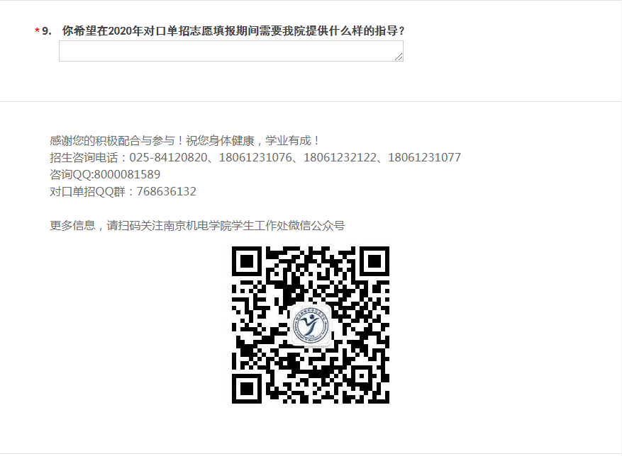 你们好!疫情当前,就是考验!报名调整,咨询在线!为了做好对口单招志愿填报咨询,优化志愿填报指导服务,更好地了解高职提前招生同学们的专业选择意向,我院学生工作处特开展此项调查。请留下您的联系方式,报名时间确定后,我们第一时间短信通知!本次调查为实名调查,根据自己的实际情况填写即可!感谢您的支持!
