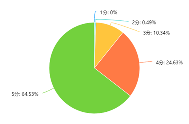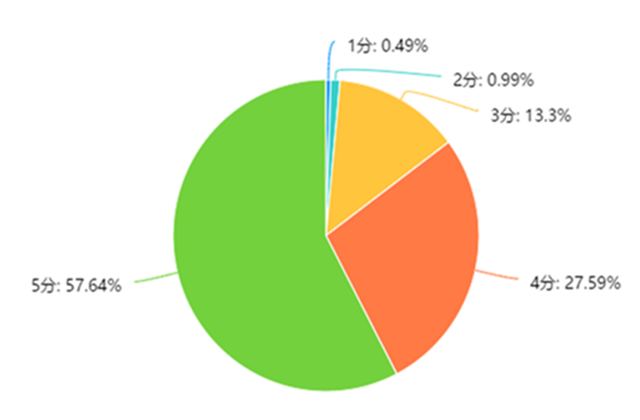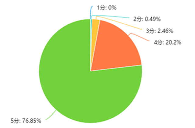 在对线上教学质量总体满意度进行评价时,满意度4分以上的占89.17%,认为不满意的学生仅有0.49%(详见图4:线上课程教学总体满意度程度),说明大多数学生对线上教学质量是满意的,教学效果较好。从线上、线下课程比较来看,与线下课程教学质量相比,满意度4分以上的占85.23%(详见图5:与线下相比对线上课程教学质量的满意度),该项满意度是所有满意度中最低的,学生认为相比较而言线下教学效果更好,更期待教室上课