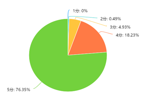 多数教师线上授课准备充分,学生对所在班级任课教师线上课程教学备课充分的满意度较高,满意度4分以上的占97.05%(详见图1:线上课程教学备课充分的满意度);多数教师对线上课程学习目标和要求阐述得清楚,学生满意度4以上94.58%(详见图2:对课程学习目标和要求阐述的明确性的满意度);多数教师线上课程教学过程中与学生展开互动,学生对所在班级任课教师线上课程教学中互动情况的满意度较高,满意度4分以上的占93.11%(详见图3:线上课程教学中互动情况的满意度),问卷中关于教师每节课互动次数调查数据显示,各任课教师每次课互动次数都在3次以上。