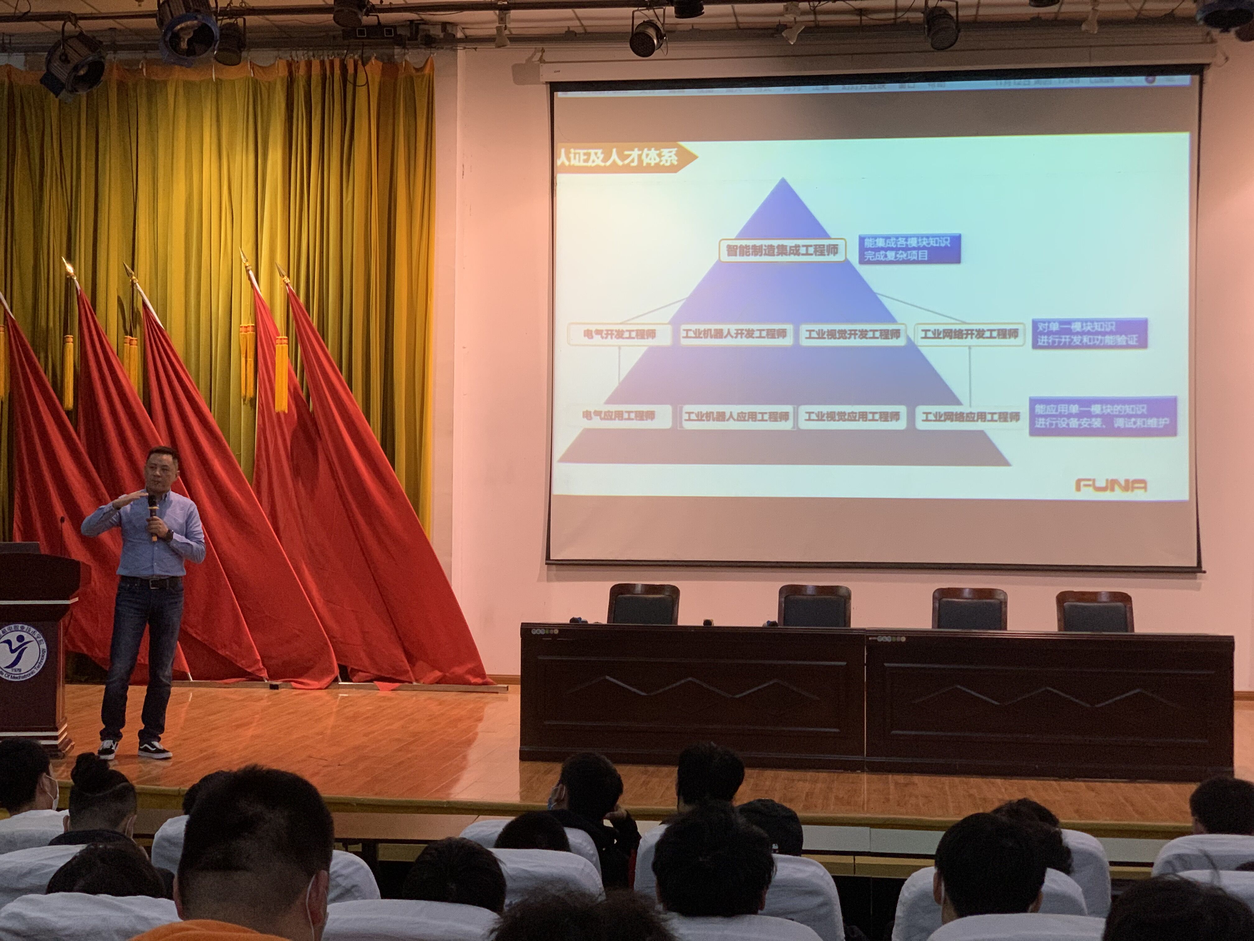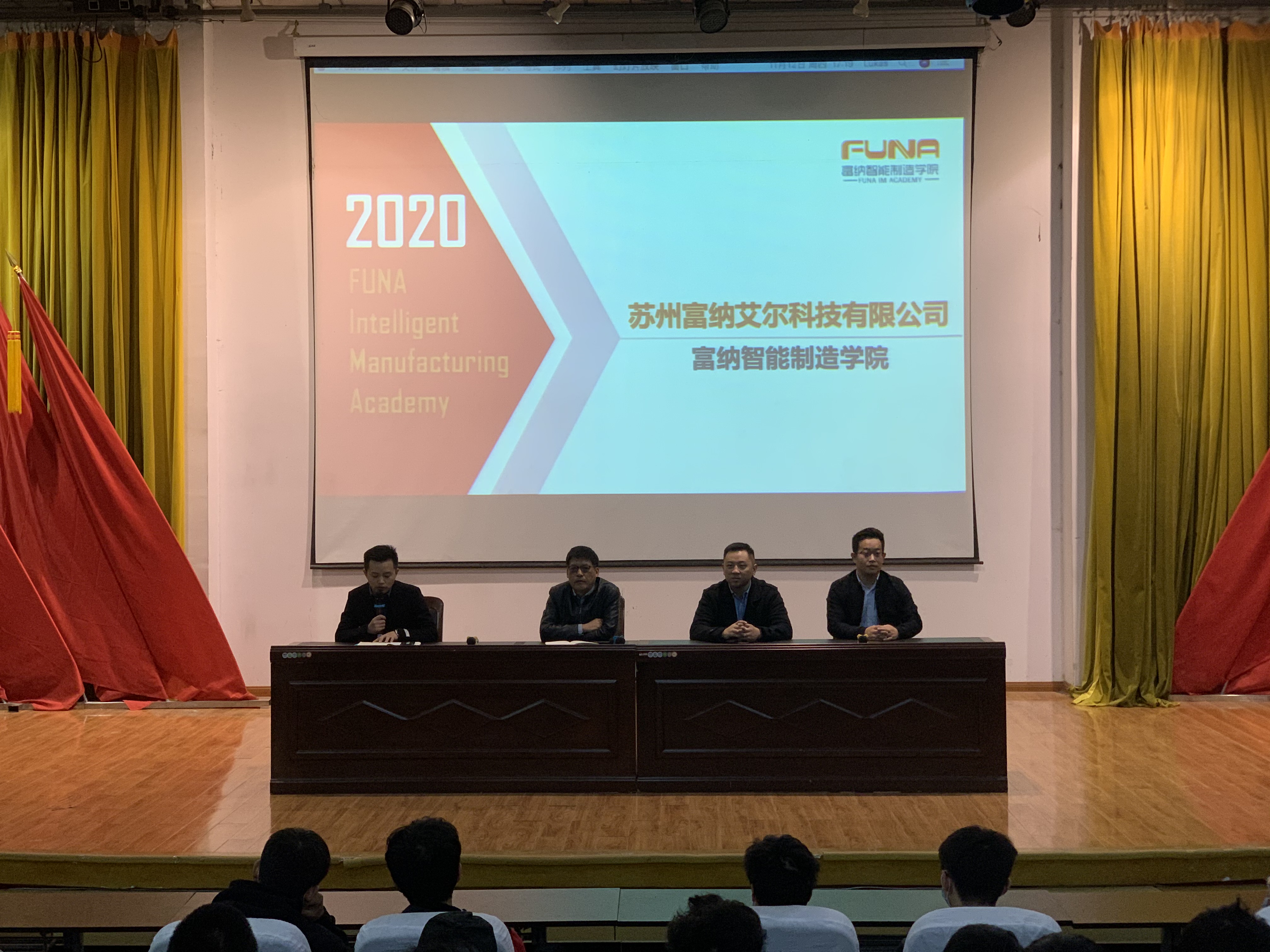 1112日下午520分,富纳智能制造学院在报告厅面向电气自动化专业群学生,进行了现代学徒制试点班组建的宣讲。富纳智能制造学院校企合作部经理李熙、研发部经理陈勇出席了宣讲会,我院智能制造学院执行院长潘理平、自动化工程系支部书记高水冕以及相关教师参加了宣讲会。