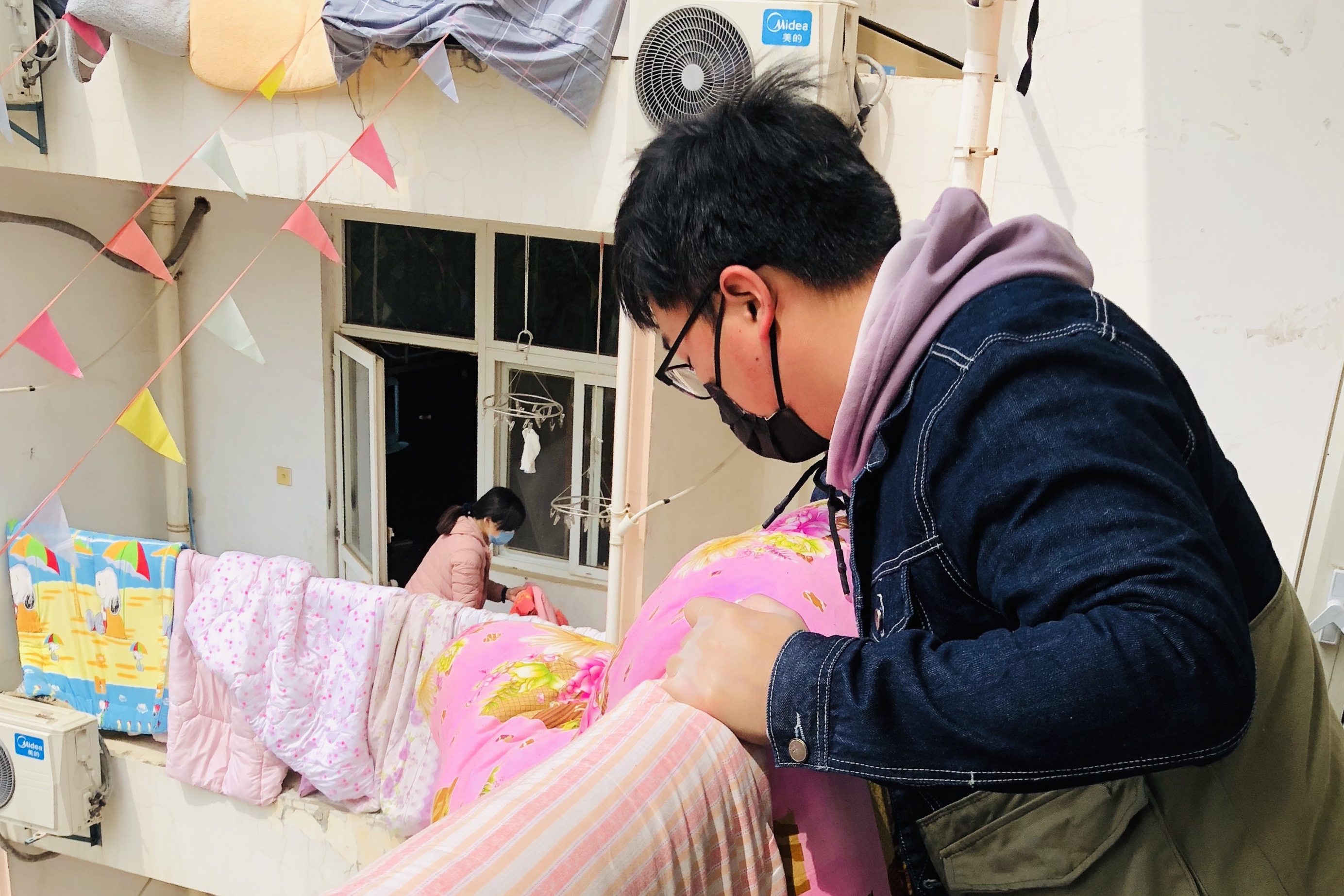 4月14日早晨,因疫情放假已有三余月的学生宿舍热闹起来,自动化工程系全体教职工展开了“为学生晒被”的暖心行动,为2栋宿舍楼100多间宿舍的同学们晒被子、做消毒工作。